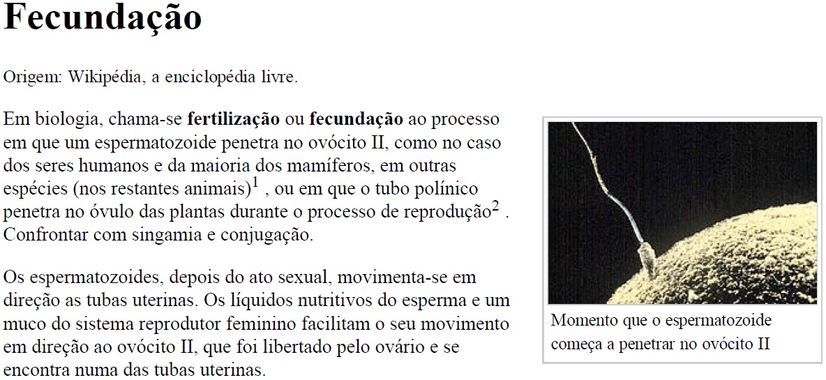 Synopsis: text of Wikipedia on the subject fertilization.Source: Wikipedia.URL: http://pt.wikipedia.org/wiki/Fecunda%C3%A7%C3%A3o